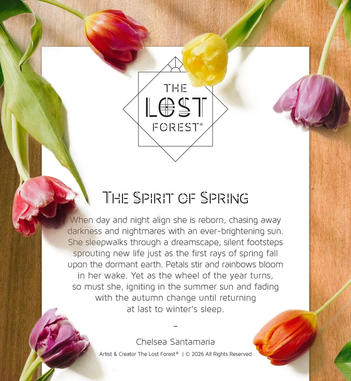“When day and night align she is reborn, chasing away darkness and nightmares with an ever-brightening sun. She sleepwalks through a dreamscape, silent footsteps sprouting new life just as the first rays of spring fall upon the dormant earth. Petals stir and rainbows bloom in her wake. Yet as the wheel of the year turns, so must she, igniting in the summer sun and fading with the autumn change until returning at last to winter’s sleep.”